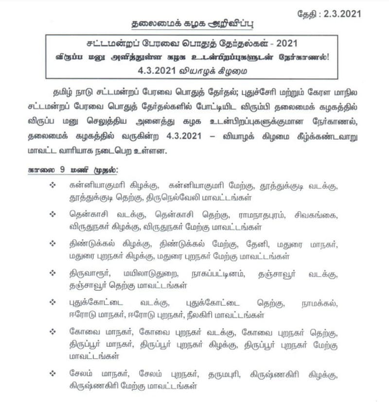 அந்த வகையில், திமுக வேட்பாளர் நேர்காணல் நேற்று தொடங்கியது. இரண்டாவது நாளாக இன்றும் நடைபெறுகிறது. இந்நிலையில், அதிமுக வேட்பாளர் நேர்காணல் நாளை நடைபெறும் என தெரிவிக்கப்பட்டுள்ளது.